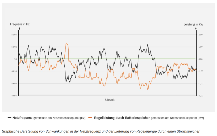 Die nachfolgende Abbildung veranschaulicht graphisch, wie ein Batteriespeicher die Schwankungen im Stromnetz durch die Lieferung von Primärregelleistung ausgleichen kann. Die schwarze Linie stellt die Schwankungen der Netzfrequenz, die am Netzanschlusspunkt gemessen wird, dar. Die orangene Linie zeigt, wie der Stromspeicher durch das Ein- bzw. Ausspeichern von Strom diese Schwankungen ausgleicht.